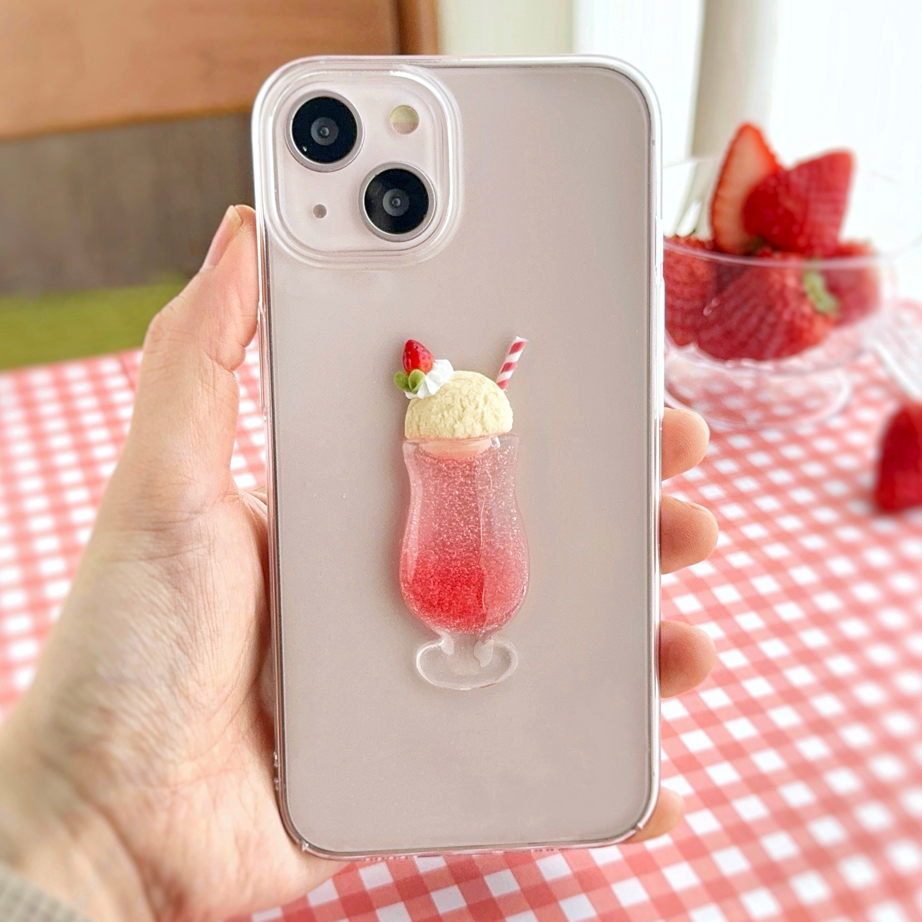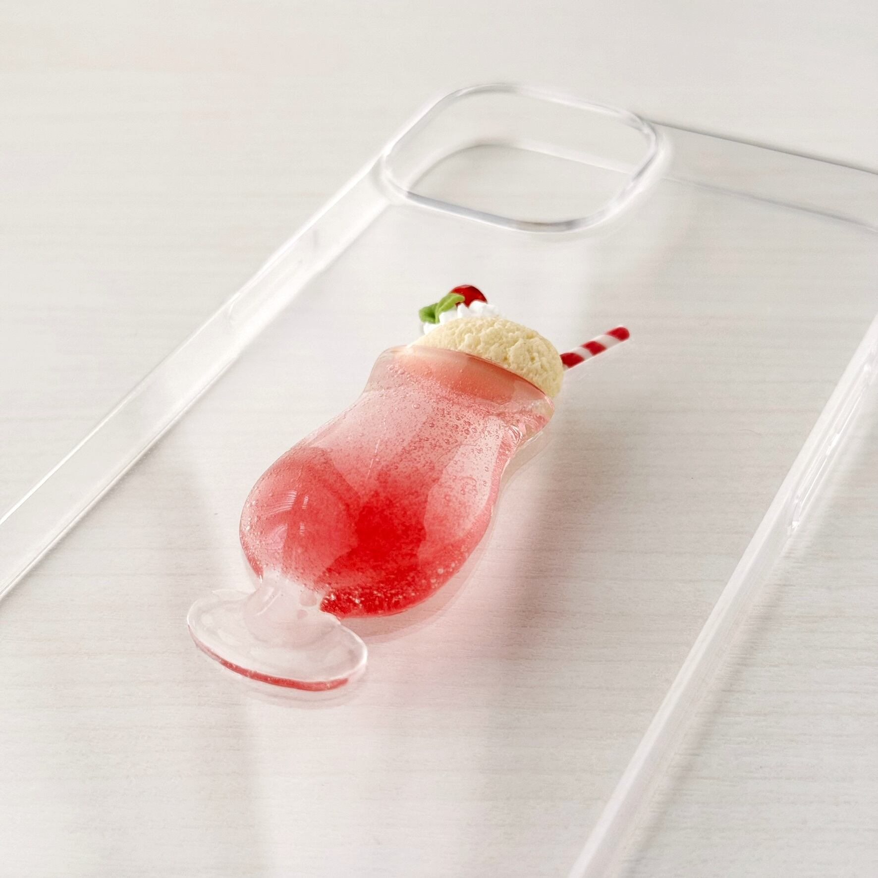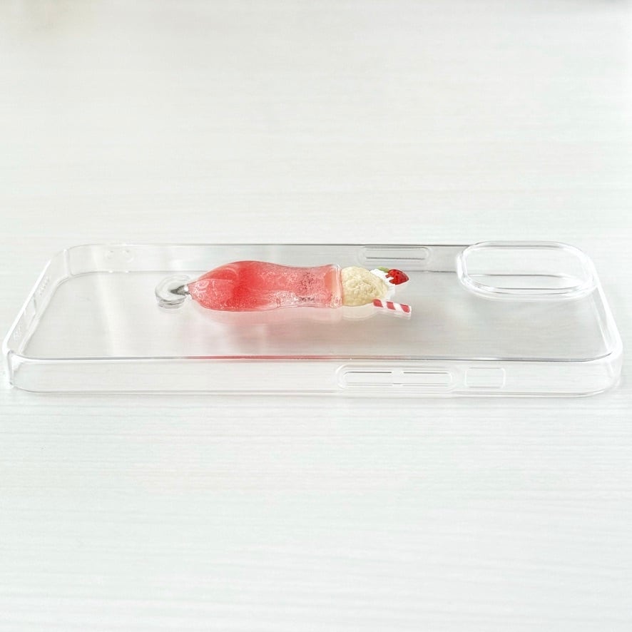 苺クリームソーダをモチーフにした、透明感あふれるスマホケースです。