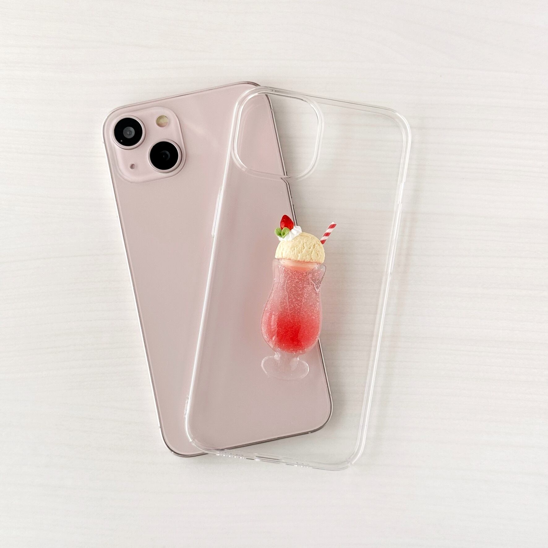 まるで純喫茶のドリンクを閉じ込めたような、ピンクが主役のクリアケースです。