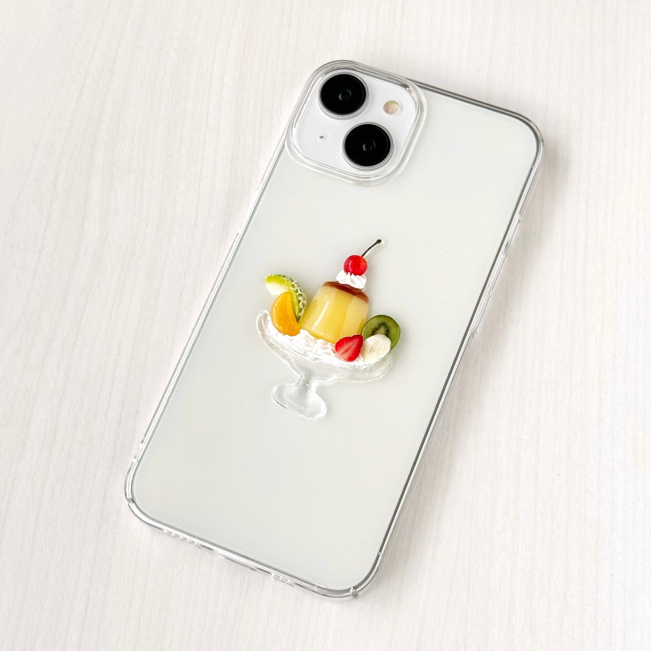 レトロなプリンアラモードがついた、クリア素材のiPhoneケースです。